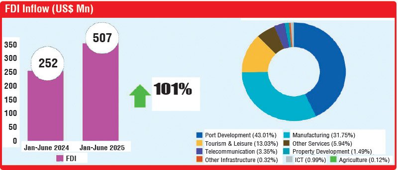 This significant rebound from $ 252 million during the same period in 2024 marks the country’s strongest first-half FDI performance in recent years and reflects deepening investor confidence in Sri Lanka’s economic reforms and investment climate.