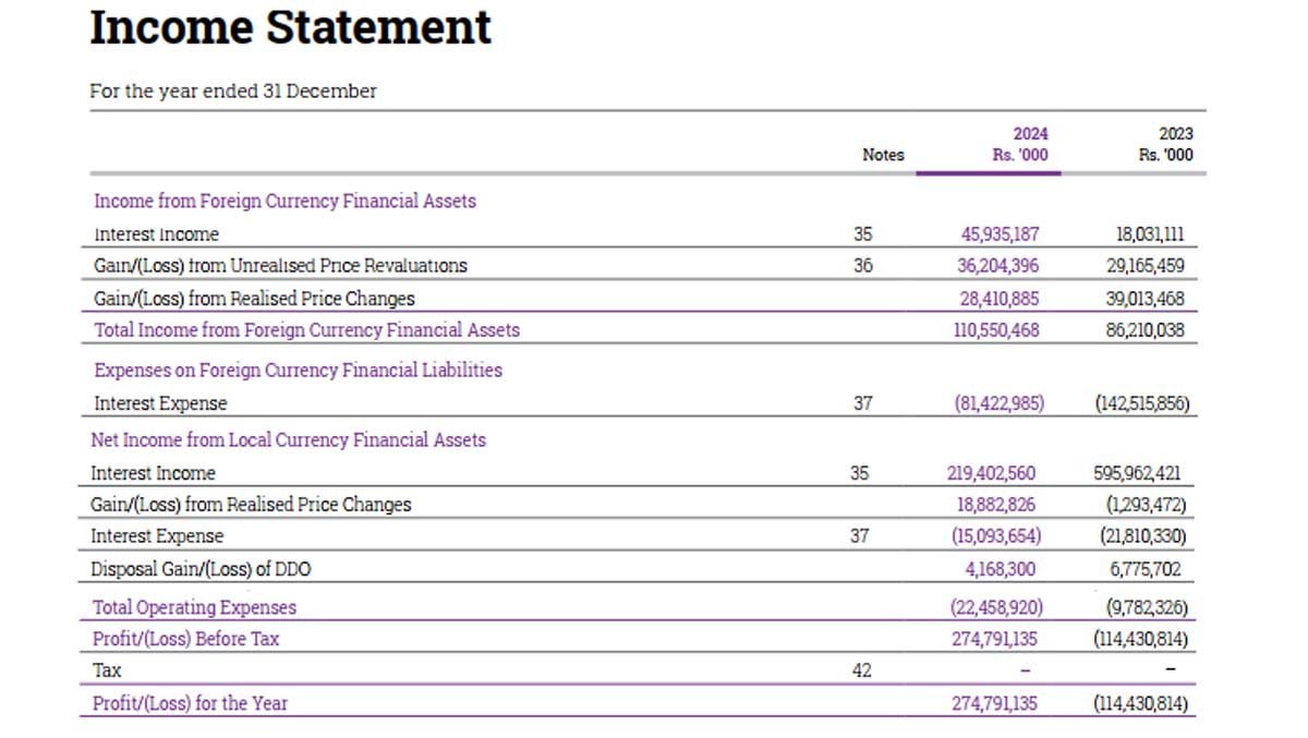 Sri Lanka’s central bank has made profits of 274 billion rupees, profit in 2024, with interest income from its bond portfolio and foreign assets, which turned positive in the year amid deflationary policy.