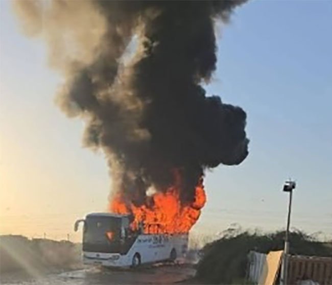 A bus transporting 20 Sri Lankan youths employed in the agricultural sector in Israel caught fire last morning (18) near Kiryat Malakhi, according to Sri Lanka’s Ambassador to Israel, Nimal Bandara.